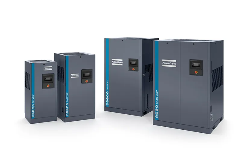 Pel que fa als compressors d’aire de cargol amb injecció d’oli, especialment la gamma GA, destaquen per la seva potència, baix consum i alta fiabilitat. A partir de 7,5 CV i amb pressions de fins a 13 bars, aquests equips ofereixen més cabal amb menys consum energètic, gràcies al seu disseny optimitzat i components sobredimensionats.